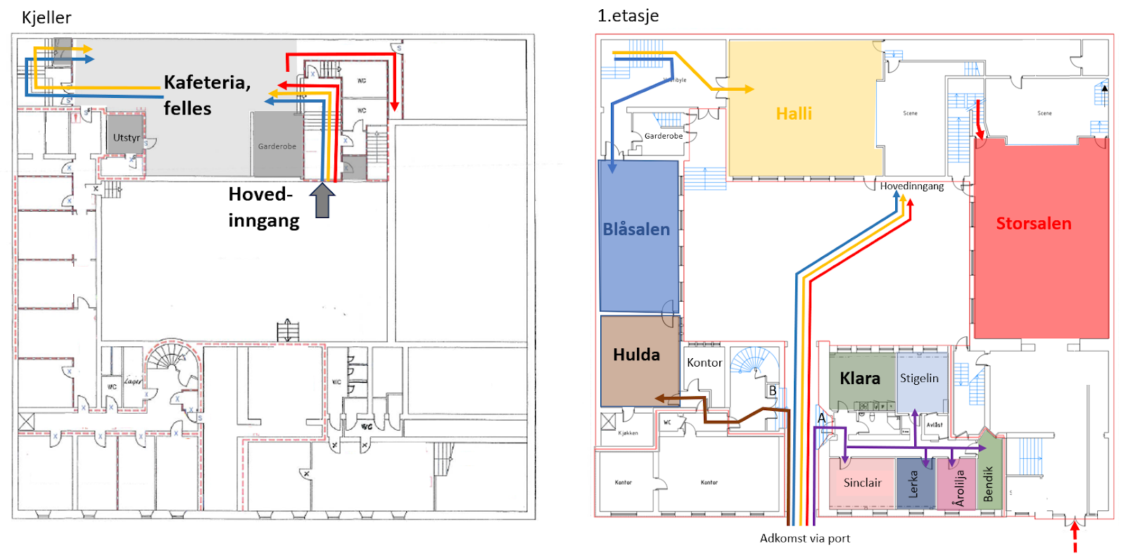 Hovedinngang inn gjennom port til bakgården. Herfra kommer man ned til kafeen og derfra videre opp til de store salene. De mindre øvingsrommene og møterommene har inngang fra portrommet, henholdsvis fra inngang A til høyre og inngang B til venstre. (Se figur under.)